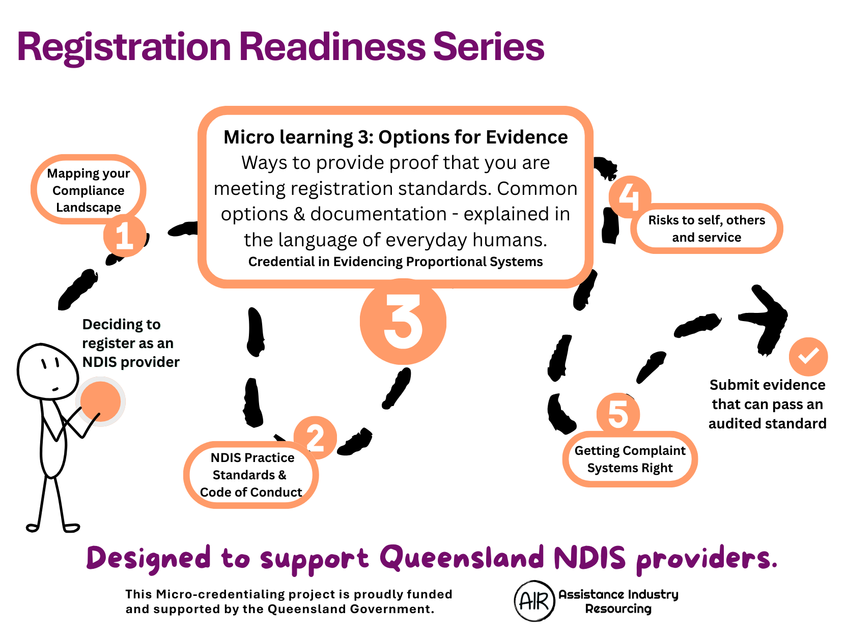 Headache it eases: Five micro-courses designed as a starting point for even the smallest NDIS service in Queensland. Each offers clear, practical overviews of the types of obligations, authorities, and considerations when your business is an NDIS one. Courses covers navigating your compliance landscape, the NDIS Standards, Code and registration process, an introduction to evidence, managing risk and understanding complaint handling in an NDIS viewpoint.
